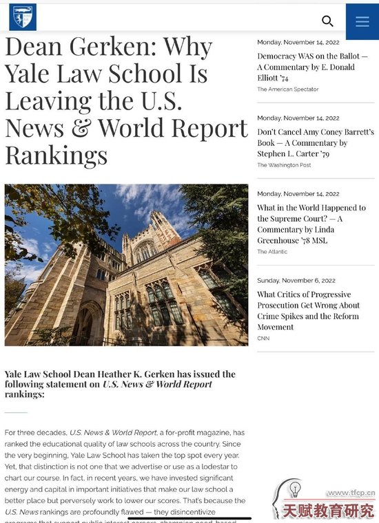 美國當(dāng)?shù)貢r(shí)間11月16日,耶魯大學(xué)法學(xué)院突然宣布“他們將退出U.S.News法學(xué)院排名”。沒過多久,哈佛大學(xué)法學(xué)院也緊隨其后,宣布“將不在參加U.S.News對(duì)頂級(jí)法學(xué)院的年度排名”。